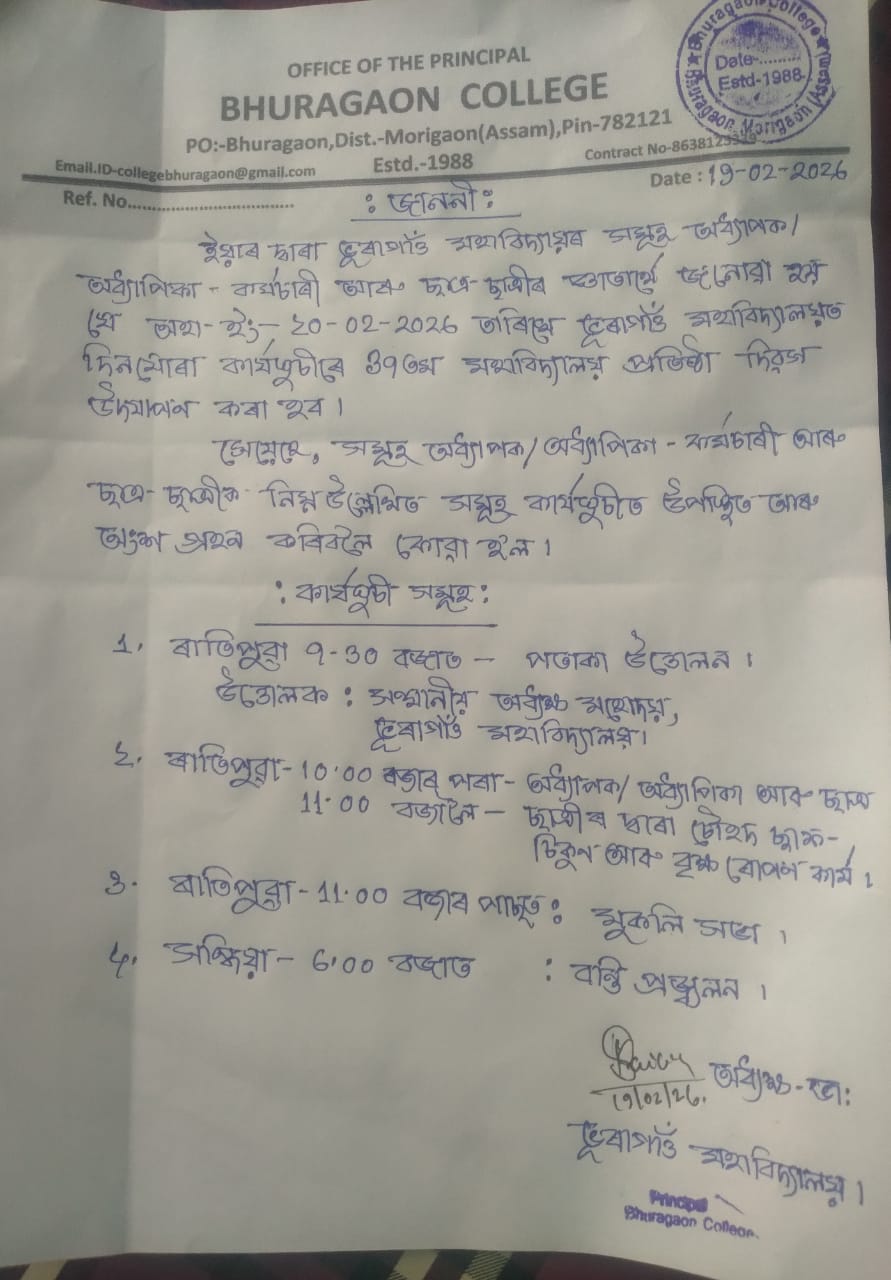 Bhuragaon College is one of the pioneer higher education institutions in the district of Morigaon, Assam. The College is located to the north, approximately 20 kilometers, from the district headquarters of Morigaon, lying quite adjacent to the Brahmaputra River which is hardly 300 meters away. Despite having innumerable hurdles and financial setbacks, the College can keep pace with the changing educational scenario that augments promises for aspirants to a new dawn of knowledge every day and every moment. The College was established on 20th February 1988. It has 20 bighas of land to accommodate any spacious educational infrastructure with the serene atmosphere that flows within from the longest northeastern river, the Brahmaputra. The College is working as a catalyst in offering a platform to cater to the social, educational, and psychological needs of the region which is marked by its multi-lingual and multi-cultural nature. Established some 35 years ago when barely there were more than two higher education institutions in Morigaon district, Bhuragaon College has been continuously and relentlessly developing and has been trying to keep its promises to disseminate knowledge and filter that to wisdom among every young aspirant to this beautiful abode for learning. The College would not have been in its present status, had there been no contributions by the then-learning enthusiasts such as the Late Upendra Narayan Singh, Anand Mohan, Late Abdul Jalil, Manabendra Saha, Mihiram Bora, Sri Madharam kakati, and lot more others all of whose names I cannot mention here because of the paucity of space, but can remember with appropriate respect and reverence. A college that is haunted more than twice by the flash-flood of the Brahmaputra River which makes it impossible for any greeneries to grow on the campus, and still not to falter but to stand straight, is sufficient to prove its priceless efforts to sacrifice for a mission of extending its support to the needy who are more often from the extremely poorer section of the society. The College though in a humble stage today even, yet it sustains to operate with its examination center and offers almost all the Arts subjects such as English, Assamese, Economics, Education, Political Science, History that have Honours courses, and Philosophy, Geography, and Arabic which have Regular or General courses. Besides having these, our college also takes its pleasure to announce the introduction of Distance Learning courses from The IDOL which run parallel with Regular courses under Gauhati University. Besides, our college offers the Scouts & Guides program as a certificate course to help secure government jobs for young aspirants.