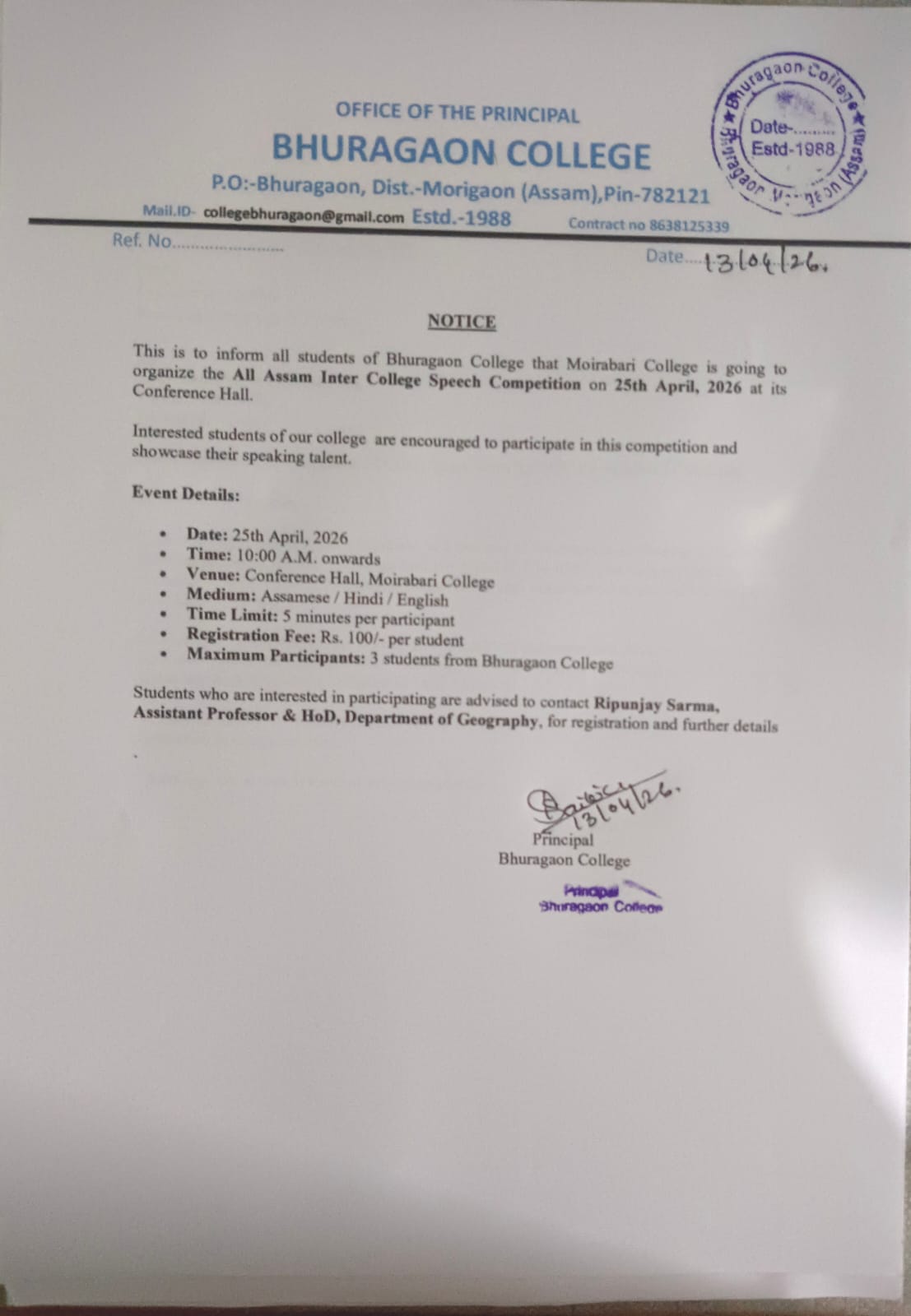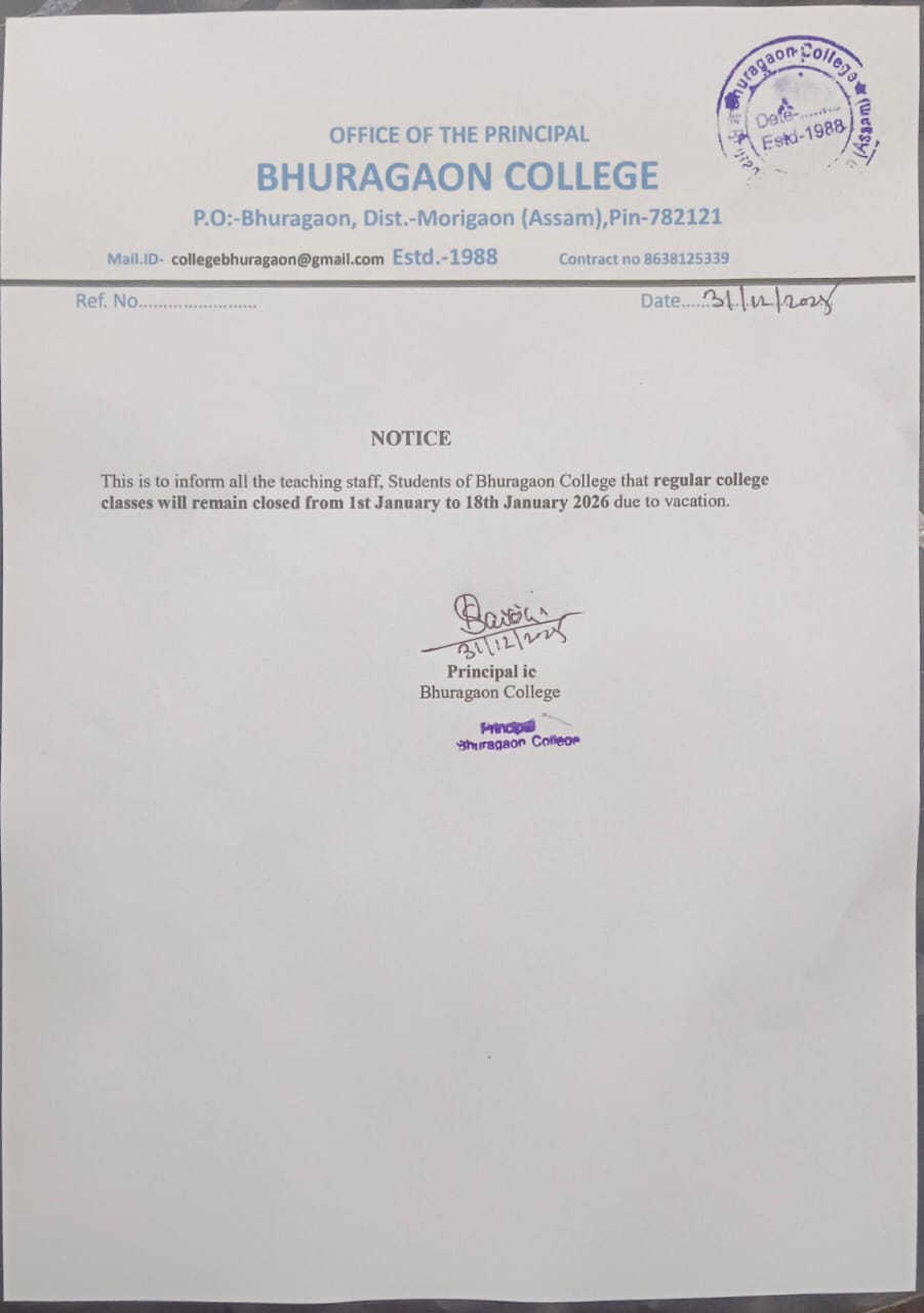 Bhuragaon College is one of the pioneer higher education institutions in the district of Morigaon, Assam. The College is located to the north, approximately 20 kilometers, from the district headquarters of Morigaon, lying quite adjacent to the Brahmaputra River which is hardly 300 meters away. Despite having innumerable hurdles and financial setbacks, the College can keep pace with the changing educational scenario that augments promises for aspirants to a new dawn of knowledge every day and every moment. The College was established on 20th February 1988. It has 20 bighas of land to accommodate any spacious educational infrastructure with the serene atmosphere that flows within from the longest northeastern river, the Brahmaputra. The College is working as a catalyst in offering a platform to cater to the social, educational, and psychological needs of the region which is marked by its multi-lingual and multi-cultural nature. Established some 35 years ago when barely there were more than two higher education institutions in Morigaon district, Bhuragaon College has been continuously and relentlessly developing and has been trying to keep its promises to disseminate knowledge and filter that to wisdom among every young aspirant to this beautiful abode for learning. The College would not have been in its present status, had there been no contributions by the then-learning enthusiasts such as the Late Upendra Narayan Singh, Anand Mohan, Late Abdul Jalil, Manabendra Saha, Mihiram Bora, Sri Madharam kakati, and lot more others all of whose names I cannot mention here because of the paucity of space, but can remember with appropriate respect and reverence. A college that is haunted more than twice by the flash-flood of the Brahmaputra River which makes it impossible for any greeneries to grow on the campus, and still not to falter but to stand straight, is sufficient to prove its priceless efforts to sacrifice for a mission of extending its support to the needy who are more often from the extremely poorer section of the society. The College though in a humble stage today even, yet it sustains to operate with its examination center and offers almost all the Arts subjects such as English, Assamese, Economics, Education, Political Science, History that have Honours courses, and Philosophy, Geography, and Arabic which have Regular or General courses. Besides having these, our college also takes its pleasure to announce the introduction of Distance Learning courses from The IDOL which run parallel with Regular courses under Gauhati University. Besides, our college offers the Scouts & Guides program as a certificate course to help secure government jobs for young aspirants.