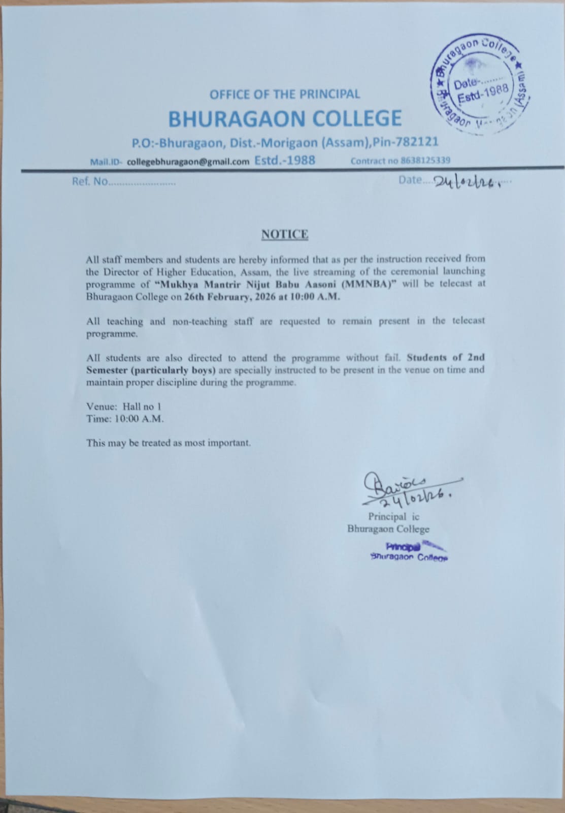 Bhuragaon College is one of the pioneer higher education institutions in the district of Morigaon, Assam. The College is located to the north, approximately 20 kilometers, from the district headquarters of Morigaon, lying quite adjacent to the Brahmaputra River which is hardly 300 meters away. Despite having innumerable hurdles and financial setbacks, the College can keep pace with the changing educational scenario that augments promises for aspirants to a new dawn of knowledge every day and every moment. The College was established on 20th February 1988. It has 20 bighas of land to accommodate any spacious educational infrastructure with the serene atmosphere that flows within from the longest northeastern river, the Brahmaputra. The College is working as a catalyst in offering a platform to cater to the social, educational, and psychological needs of the region which is marked by its multi-lingual and multi-cultural nature. Established some 35 years ago when barely there were more than two higher education institutions in Morigaon district, Bhuragaon College has been continuously and relentlessly developing and has been trying to keep its promises to disseminate knowledge and filter that to wisdom among every young aspirant to this beautiful abode for learning. The College would not have been in its present status, had there been no contributions by the then-learning enthusiasts such as the Late Upendra Narayan Singh, Anand Mohan, Late Abdul Jalil, Manabendra Saha, Mihiram Bora, Sri Madharam kakati, and lot more others all of whose names I cannot mention here because of the paucity of space, but can remember with appropriate respect and reverence. A college that is haunted more than twice by the flash-flood of the Brahmaputra River which makes it impossible for any greeneries to grow on the campus, and still not to falter but to stand straight, is sufficient to prove its priceless efforts to sacrifice for a mission of extending its support to the needy who are more often from the extremely poorer section of the society. The College though in a humble stage today even, yet it sustains to operate with its examination center and offers almost all the Arts subjects such as English, Assamese, Economics, Education, Political Science, History that have Honours courses, and Philosophy, Geography, and Arabic which have Regular or General courses. Besides having these, our college also takes its pleasure to announce the introduction of Distance Learning courses from The IDOL which run parallel with Regular courses under Gauhati University. Besides, our college offers the Scouts & Guides program as a certificate course to help secure government jobs for young aspirants.